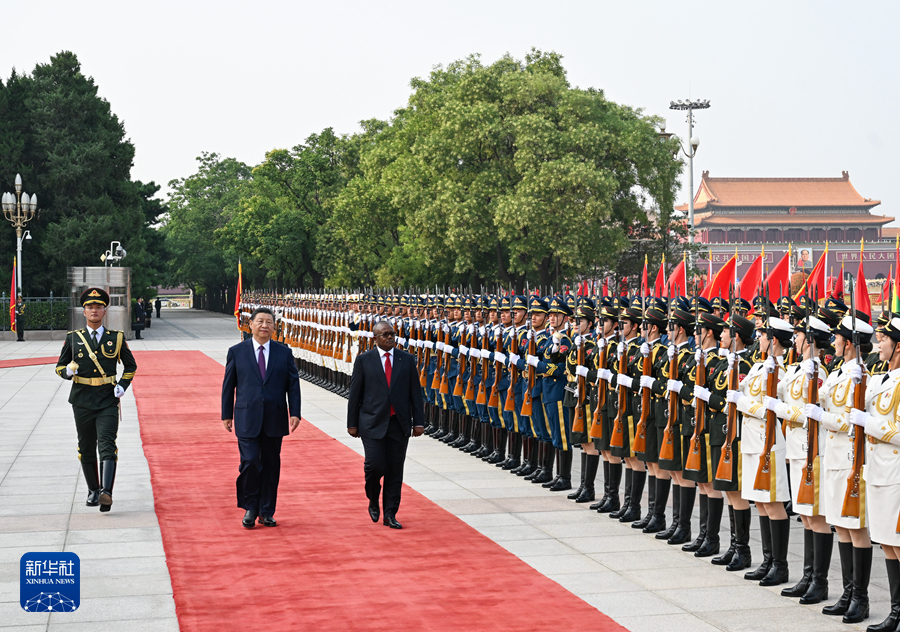 ??恩巴洛抵達(dá)時(shí),禮兵列隊(duì)致敬。兩國元首登上檢閱臺(tái),軍樂團(tuán)奏中國和幾內(nèi)亞比紹兩國國歌,天安門廣場鳴放21響禮炮。恩巴洛在習(xí)近平陪同下檢閱中國人民解放軍儀仗隊(duì),并觀看分列式。